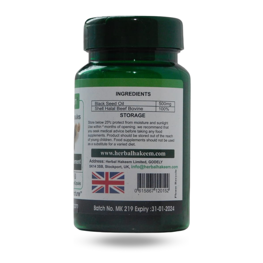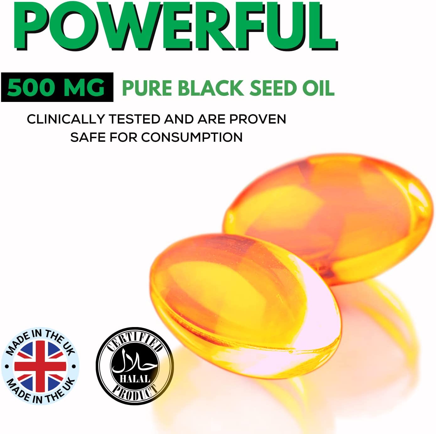- Cold-pressed virgin black seed oil, Pure Nigella Sativa, encapsulated in a soft gel capsule made from Halal beef bovine.